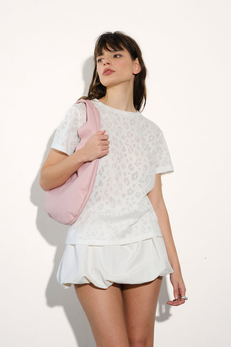 Remera regular básica de textil calado animal print y bordado de moneda marcaria en espalda.