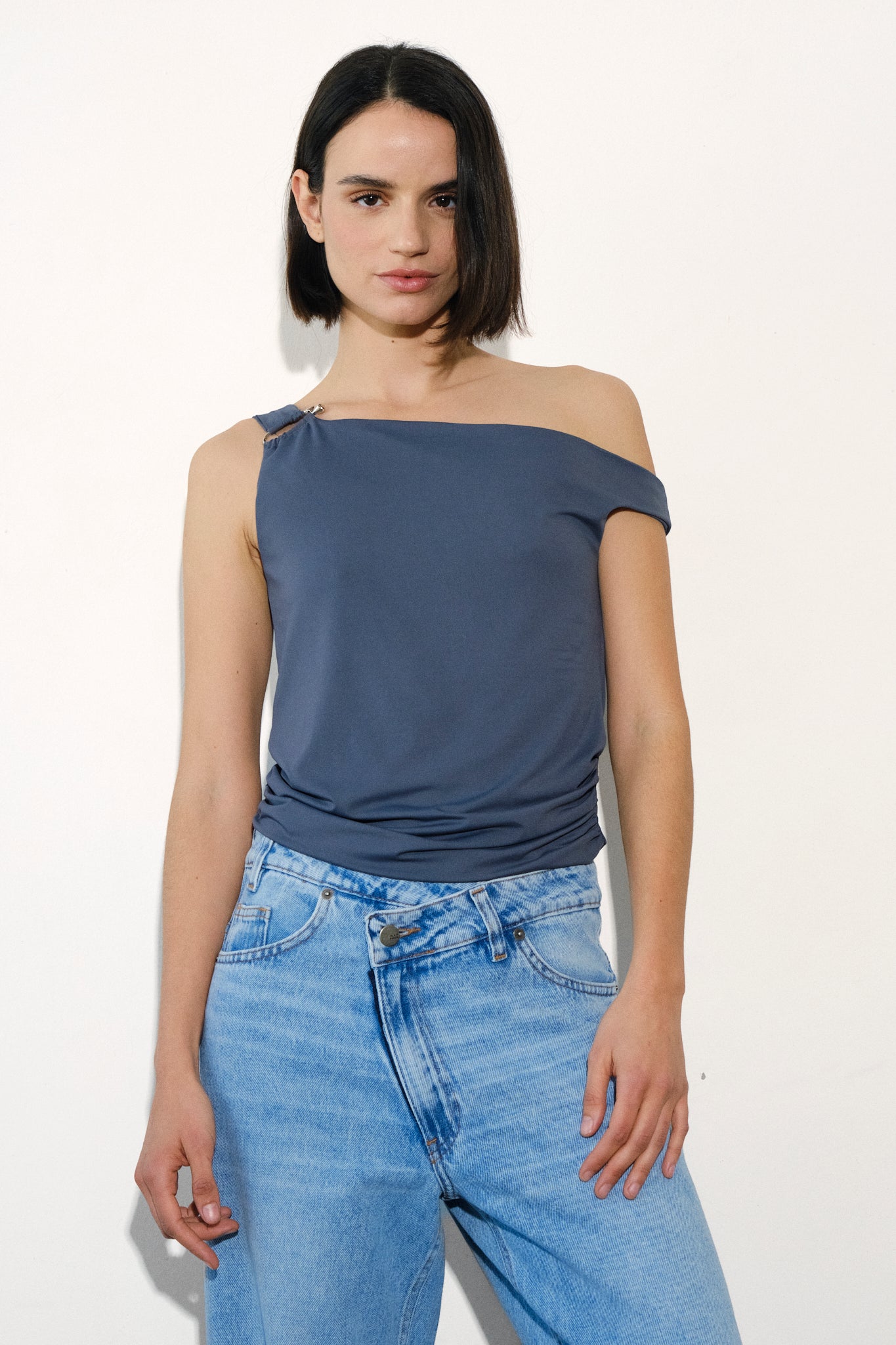 Top de punto embolsado con fruncidos laterales y detalle de avío metálico