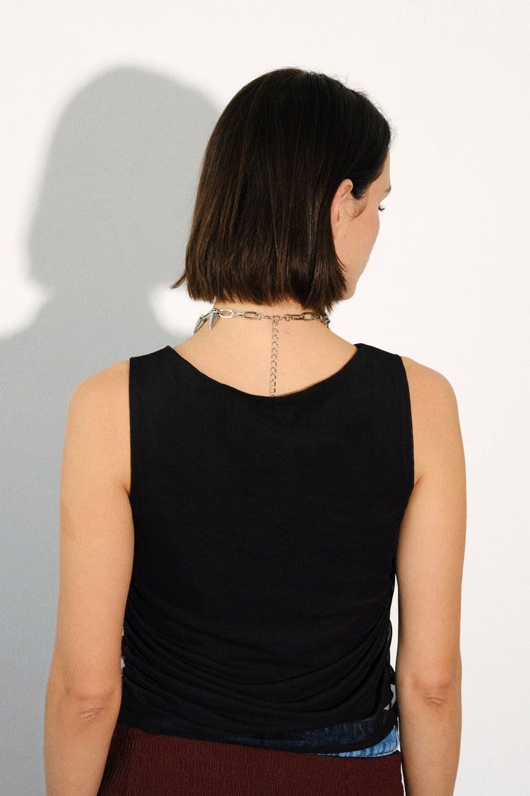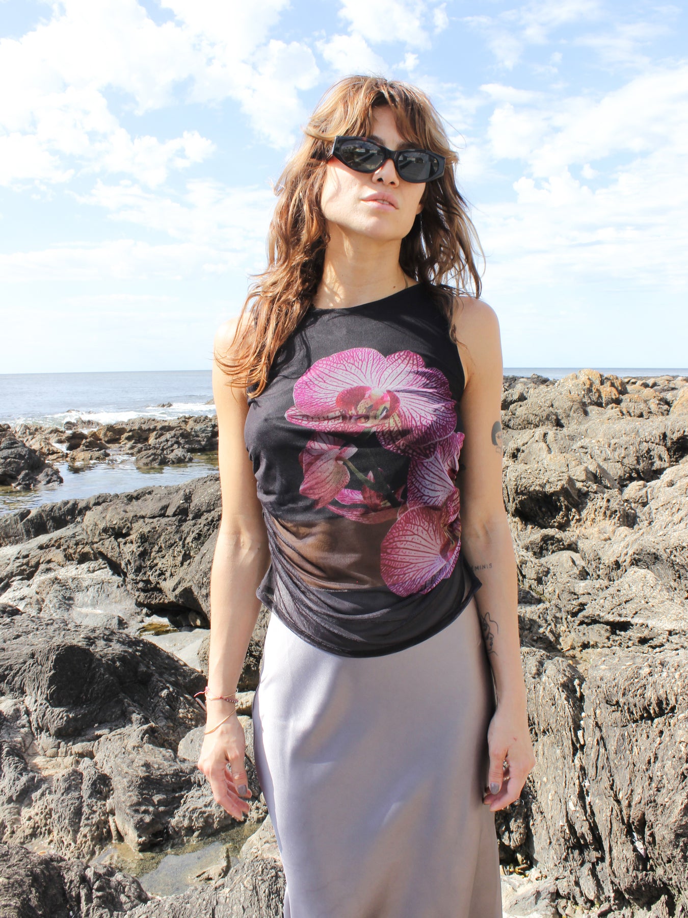 Top musculosa de microtul forrado con fruncido laterales y estampa de orquídea