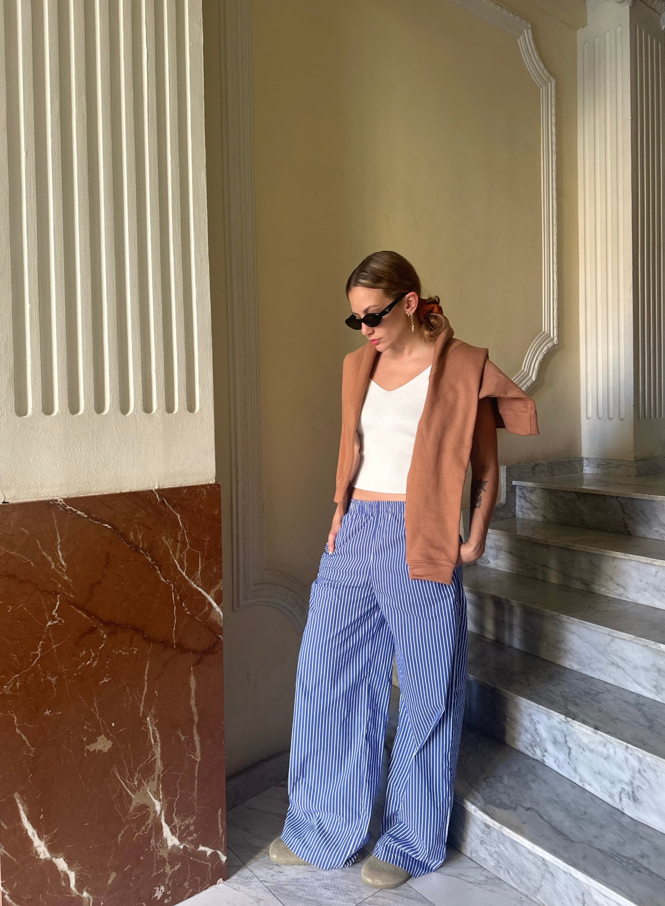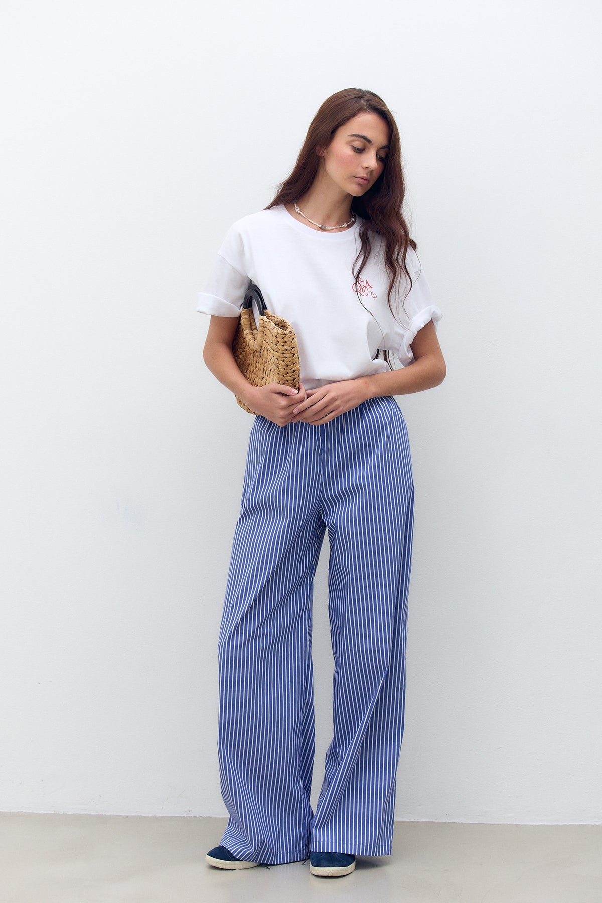 Pantalón recto de poplin rayado con elástico en cintura y bolsillos ocultos en laterales.