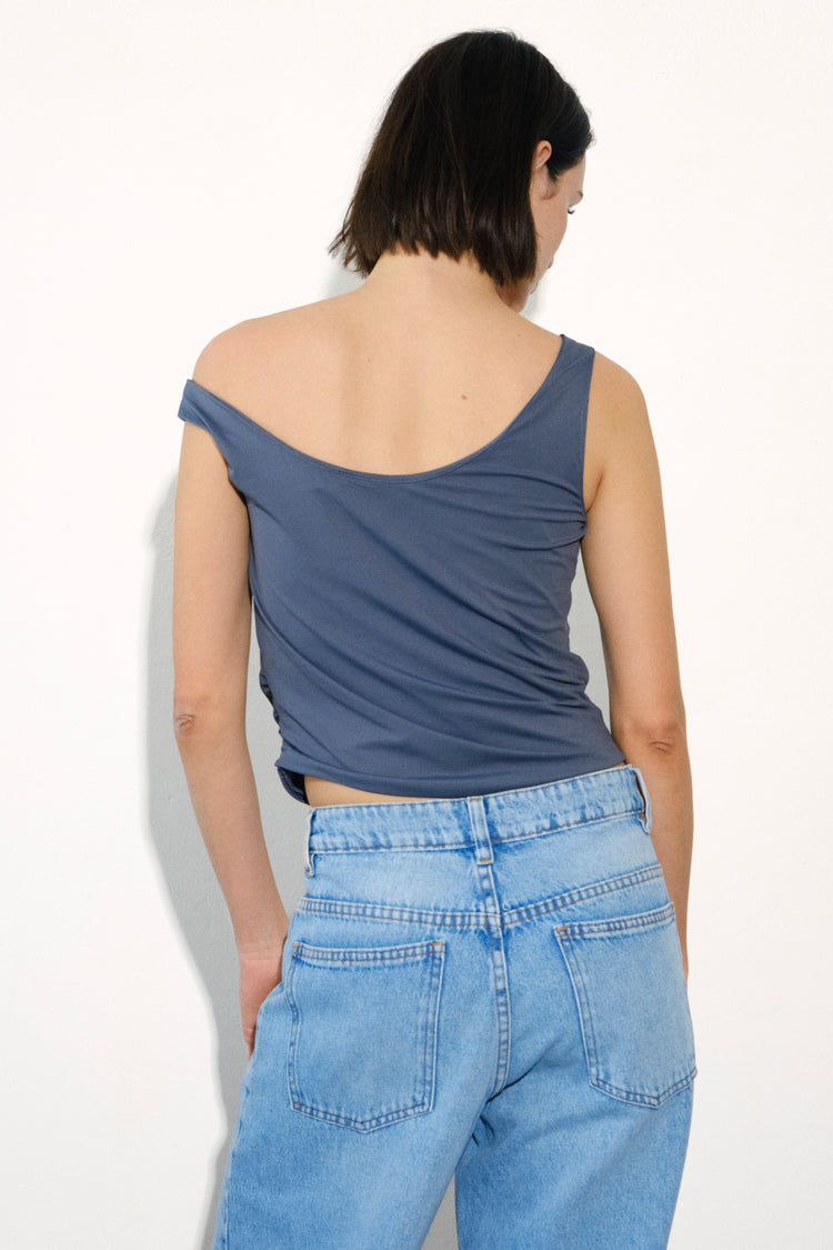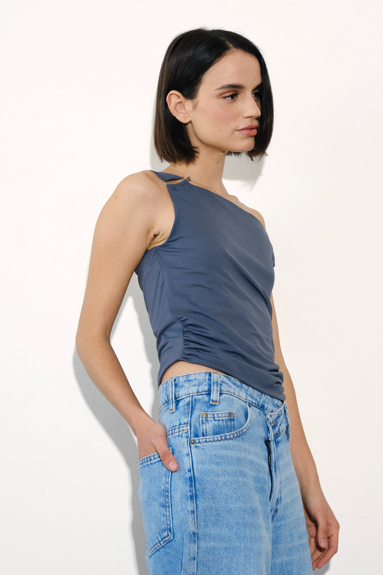 Top de punto embolsado con fruncidos laterales y detalle de avío metálico